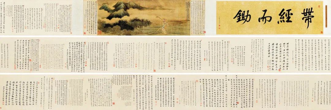 图文来源:永乐拍卖LOT 848清代 禹之鼎(1647-1716)带经荷锄图手卷 设色绢本 清康熙庚辰年画心 39×102 cm题跋 39×821 cm估价:RMB 7,000,000 - 9,000,000请横屏欣赏此作···